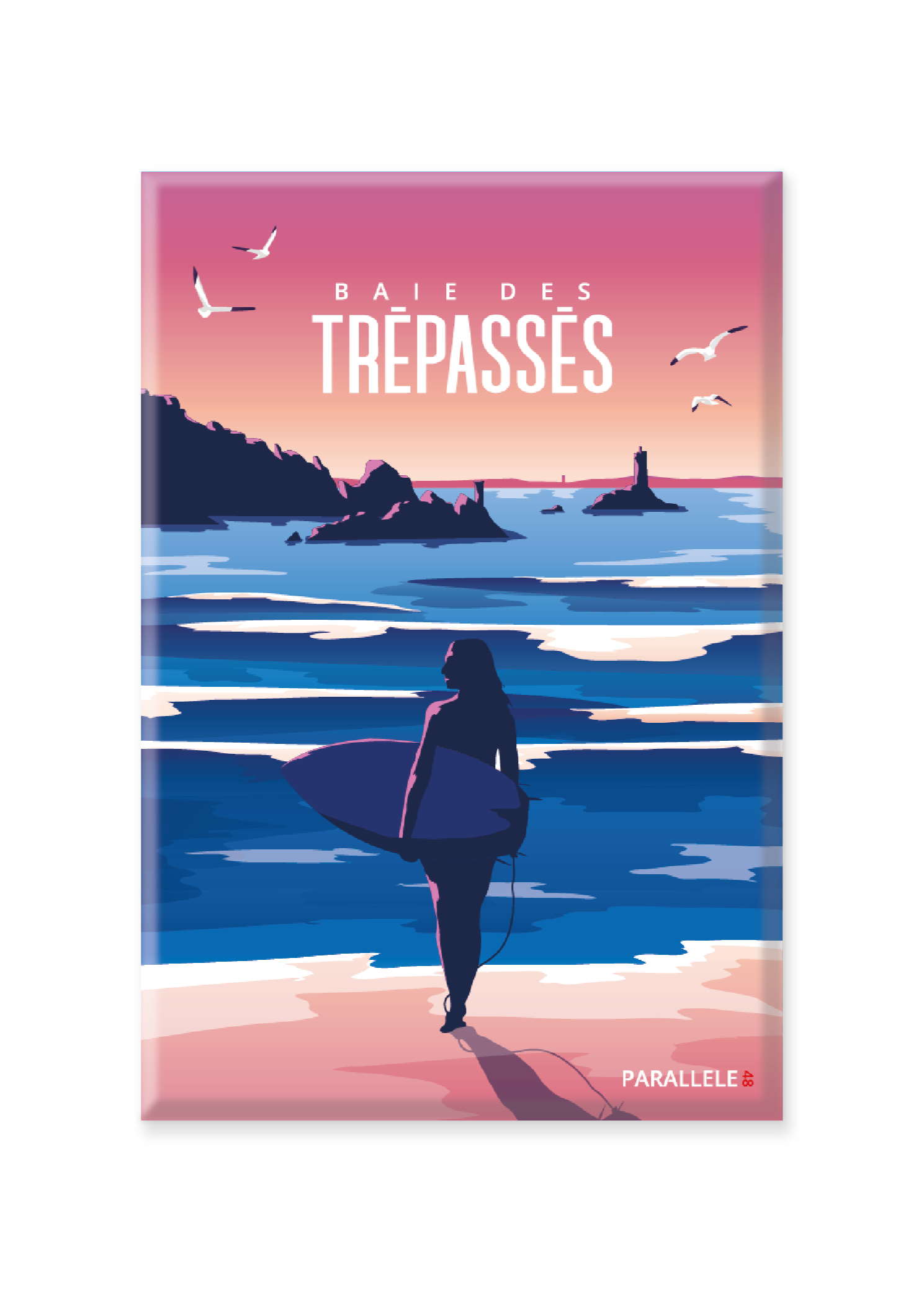 Située entre la Pointe du Raz et la Pointe du Van, la Baie des Trépassés est un spot prisé par les amoureux des vagues. L'illustration a été dessinée dans le Finistère et le magnet a été fabriqué en France.